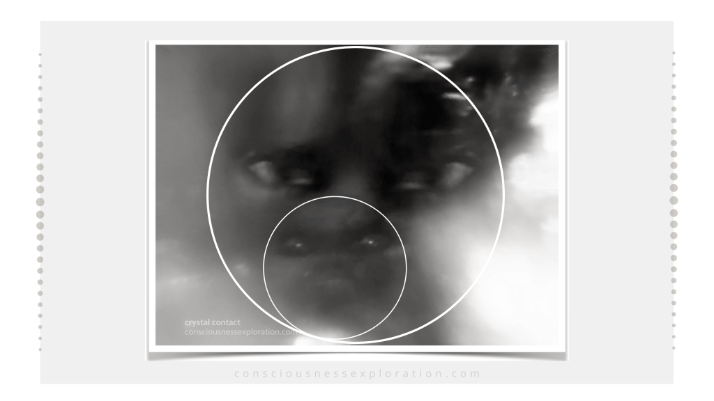 In the instance of a shared eye, what we see is the one prominent eye of the main being transmitting through. The other, shared eye, may be closed or recessed and also representative of one of its “others”. Meaning, the eyes will not in an exact sense match. This is purposefully the way in which the signals come through so that attention does not narrow down in a 3D sense upon a single being, but rather spans out into face after face after face,—until ultimately breaching additional levels of the ( complete ) transmission.